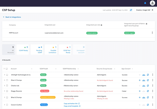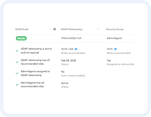 Easily perform GDAP security audits across all customer tenants in order to quickly identify which tenant is properly set-up from those requiring additional configuration.