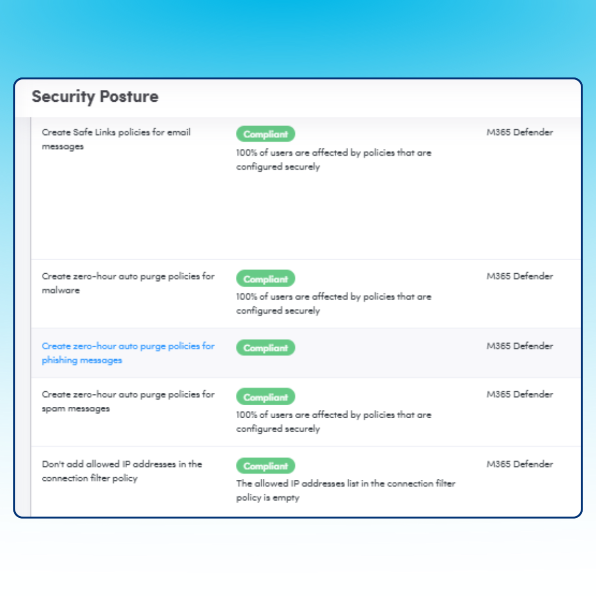 View all Defender policy configurations across tenants. Instantly spot gaps—against a unified Secure Score standard.