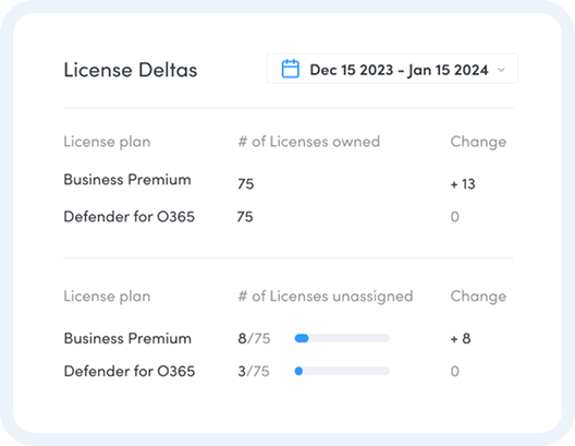 Easily view month over month changes in licensing or comparing license deltas between custom dates to deal with billing reconciliation or any disputes.